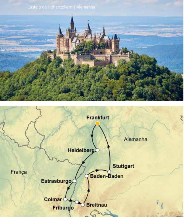 PROMOÇAO 5% OFF válido para vendas fechadas até 30 de abril. Guia acompanhante bilíngue em espanhol e português do 2° ao 7° dia. 7 dias de viagem passando por Frankfurt, Heidelberg, Estrasburgo, Colmar, Friburgo, Vogtsbauernhof, Cascatas de Triberg, Friburgo (Floresta Negra), Lago Titisee, Breitnau, Castelo Hohenzollern, Baden-Baden, Stuttgart, Frankfurt (sem hospedagem)